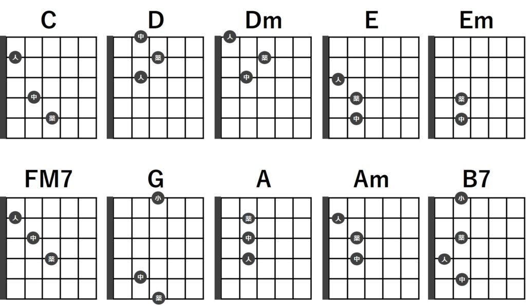 これから紹介する22曲は、下記10個のコードで全て対応可能です!